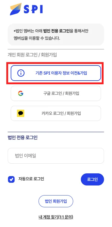 개인 회원 및 개인 멤버십 이용자: 위 기존 SPI 계정 이전을 1회 완료한 후에는 로그인 화면에서 등록하신 간편 로그인을 선택하여 로그인하시면 됩니다.
