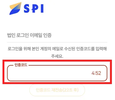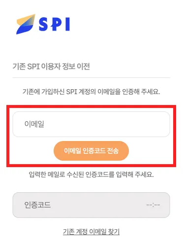 기존 SPI에 등록한 이메일 주소 입력 후 [이메일 인증코드 전송] 클릭