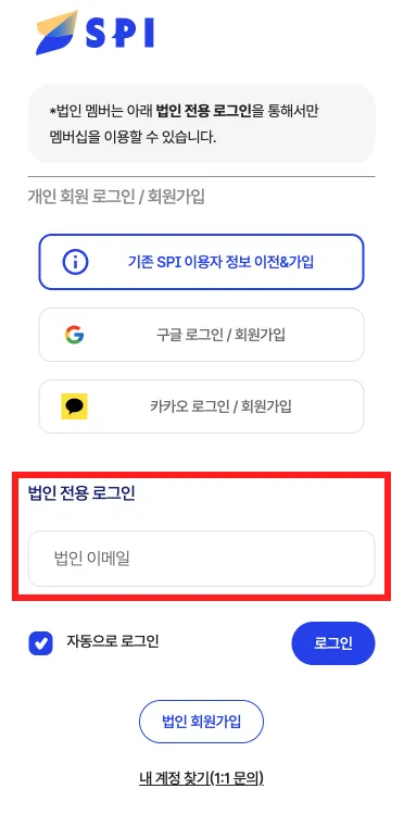 법인 회원 및 법인 멤버십 이용자: (SPI 1.0) ID/PW를 통한 로그인 → (SPI 2.0) 이메일 인증을 통한 로그인