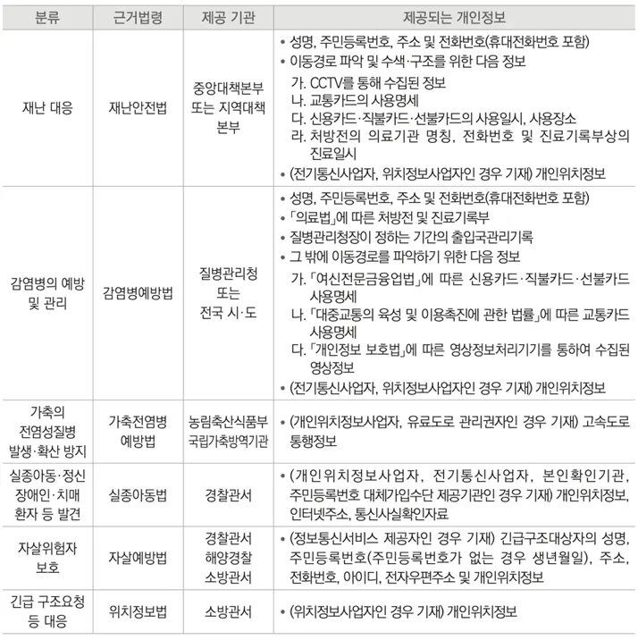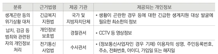 3. 다음과 같이 재난, 감염병, 급박한 생명·신체 위험을 초래하는 사건·사고, 급박한 재산 손실 등의 긴급상황이 발생하는 경우 정보주체의 동의 없이 관계기관에 개인정보를 제공할 수 있습니다.(별표 1)