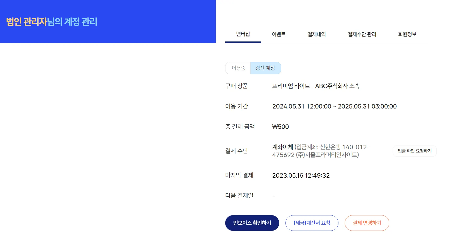 계좌이체로 진행 시 ‘갱신 예정’ 멤버십은 결제가 완료되지 않은 상태이며, 해당 화면에서 갱신 예정인 멤버십의 인보이스 확인, (세금)계산서 요청, 결제수단 변경(신용카드 결제로 변경) 등이 가능합니다.