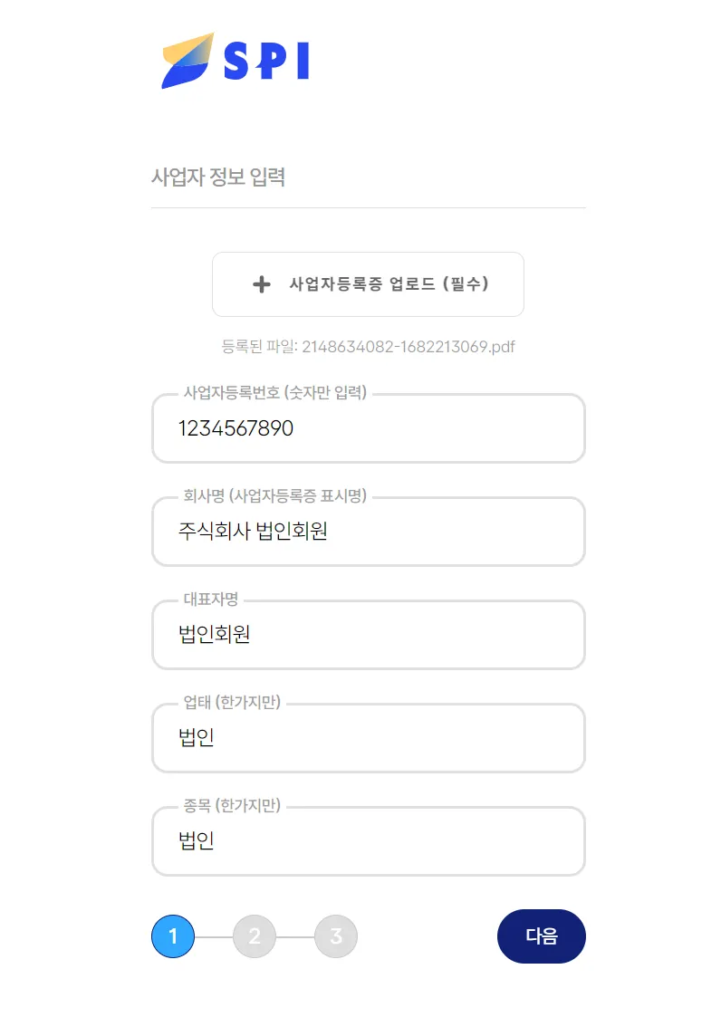 ② 사업자등록증 업로드를 클릭 후, 사업자등록증(pdf 또는 이미지 파일)을 업로드하면 정보를 자동으로 불러옵니다. 입력된 정보가 정확한지 확인/수정 후 다음 을 클릭합니다.