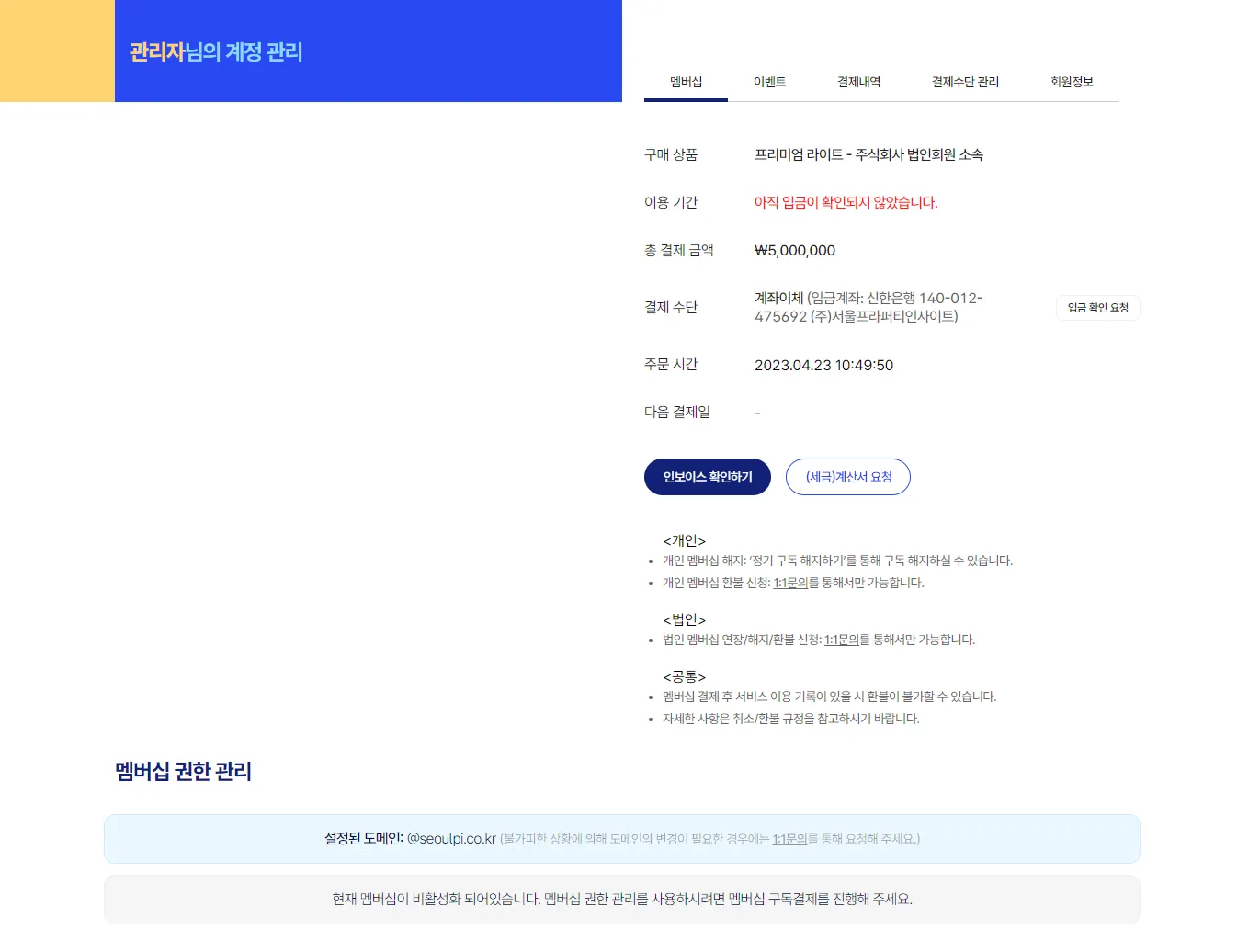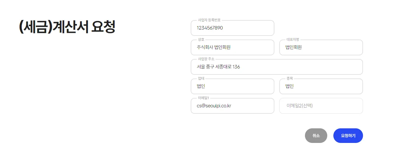 멤버십이 정상 설정된 것을 확인 후 (세금)계산서 요청을 클릭하고, 정확한 정보가 입력되었는지 확인한 뒤 요청하기를 클릭합니다. 이후 SPI 담당자가 확인 후 입력한 정보로 (세금)계산서(영수용)을 발행하여 개별 연락드립니다.