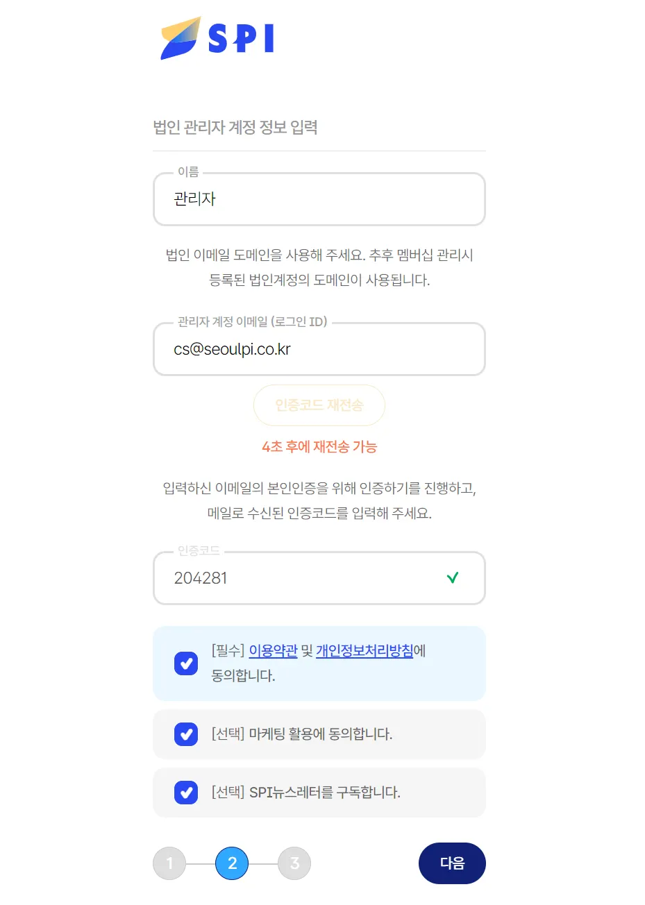 ③ 법인 관리자의 이름 및 이메일 주소를 입력하고 이메일 인증코드 전송을 클릭한 후, 관리자 이메일에서 인증코드를 확인 후 입력합니다.