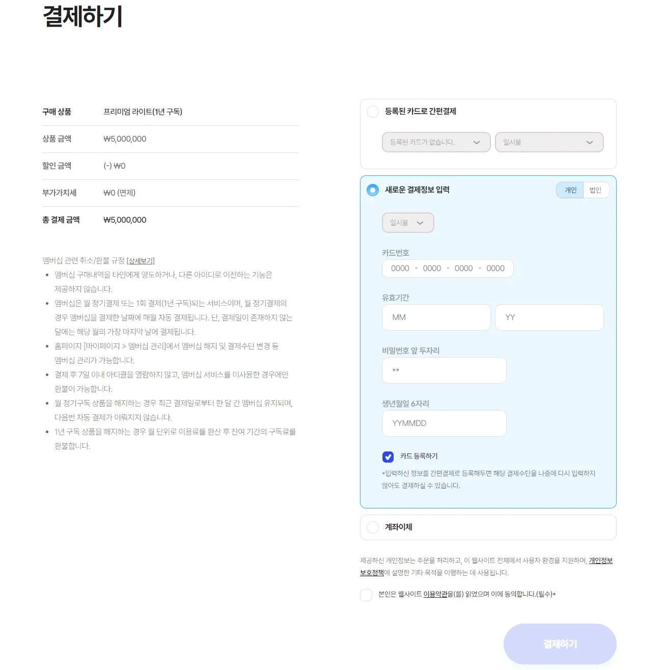 결제하기 화면에서 새로운 결제정보 입력에 결제정보를 입력하거나 등록된 카드로 간편결제를 선택합니다.(홈 우상단 계정 관리 - 결제수단 관리에서 결제 수단을 등록할 수 있습니다.)
