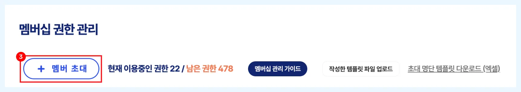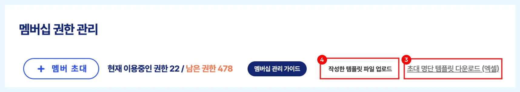 ③ 멤버십 탭에서 멤버십 권한 관리 아래의 초대 명단 템플릿 다운로드(엑셀) 을 클릭한 후 다운로드 받은 템플릿에 멤버 정보를 입력합니다.