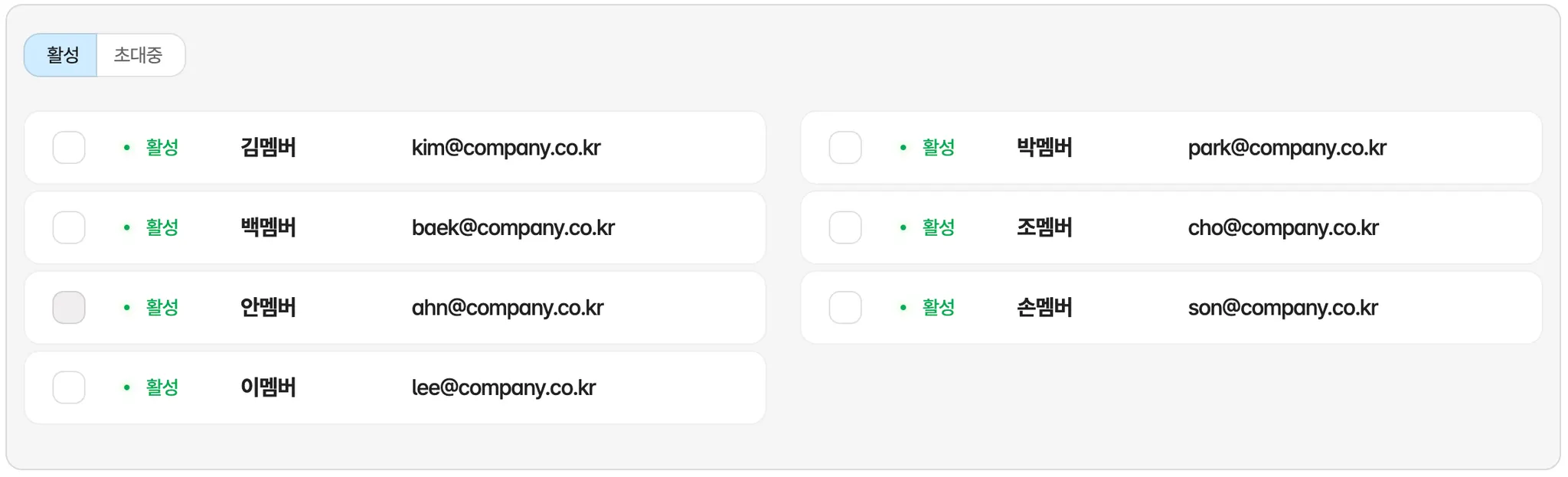 예시) 관리자 이메일이 admin@company.co.kr인 경우 user@company.co.kr 형식의 이메일만 초대(등록) 가능
